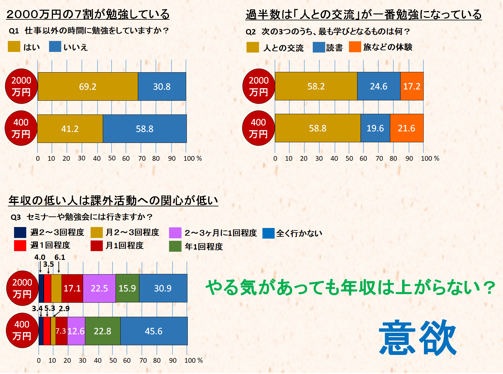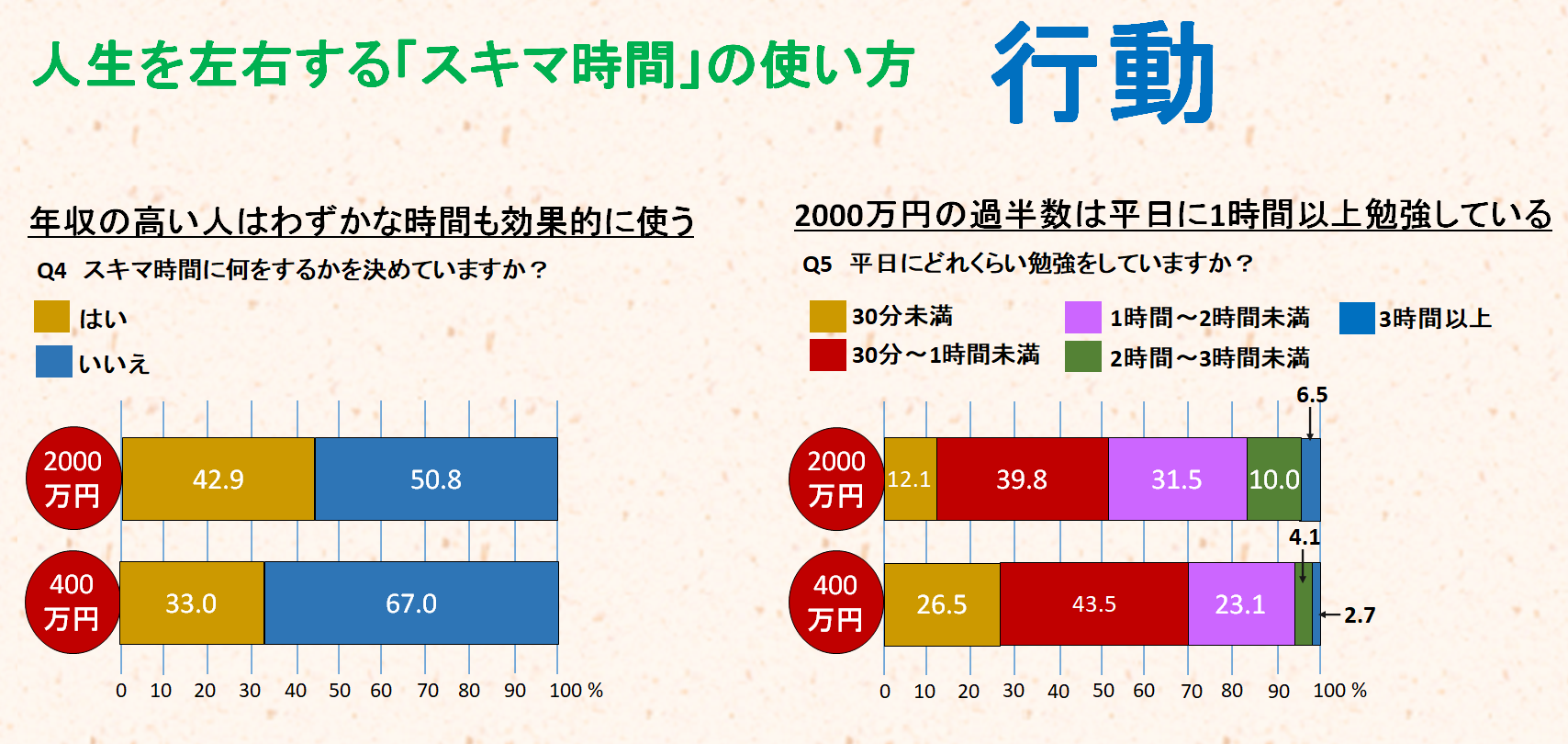 まさに収入の高い人と低い人の行動力の差が浮き彫りになったといえるでしょう。学ぶ週間を持っているかどうかが行動量の差、収入の差につながっています。