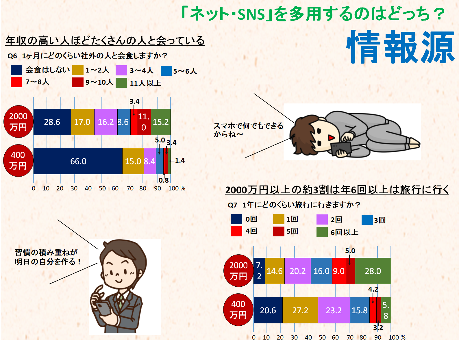 「仕事に役立てる情報源」について、2000万円以上は400万円台と比べて「新聞」、「雑誌」、「書籍」などの紙媒体を活用し、「友人・知人」、「旅などの体験」から情報を得ている人が多くいました。 一方、400万円台の人は、「ネット・SONS」、「テレビ」を情報源とする人が多くいました。「最も費用対効果の高い情報収集方法は、雑誌や書籍を読むことです。紙の情報と比べると、どうしてもインターネットやテレビでは、情報が歪められていることが多いのです。」