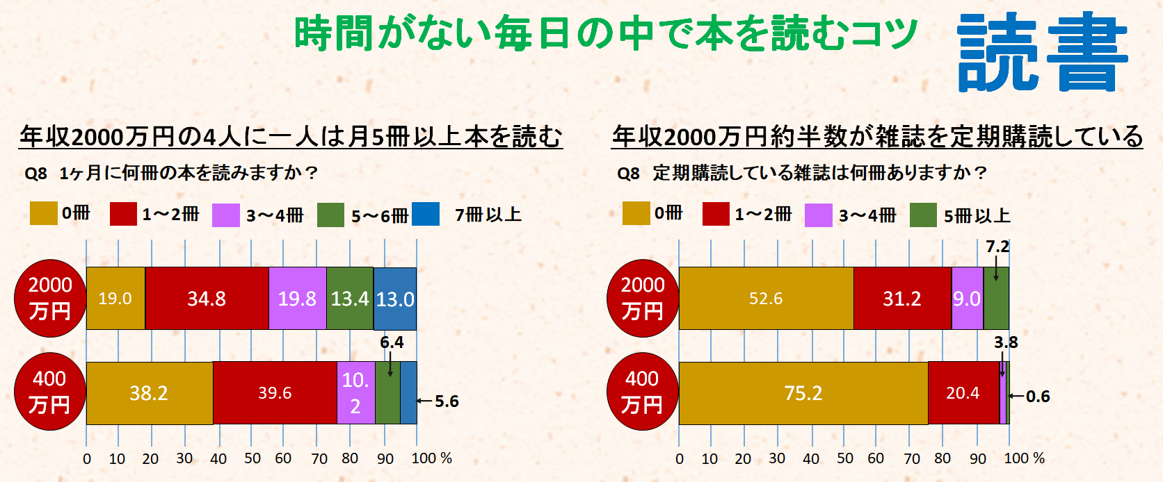まさに収入の高い人と低い人の行動力の差が浮き彫りになったといえるでしょう。学ぶ週間を持っているかどうかが行動量の差、収入の差につながっています。